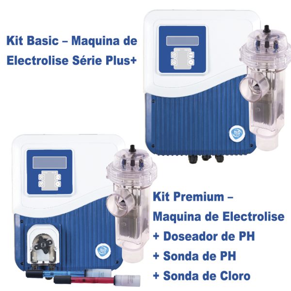 - Kit Premium — Maquina de electrolise C/Sonda + Detetor de fluxo + Controlo de salinidade + Sonda de PH e Temperatura e Doseador de PH + Sonda de Redox (Cloro) + Acessorios