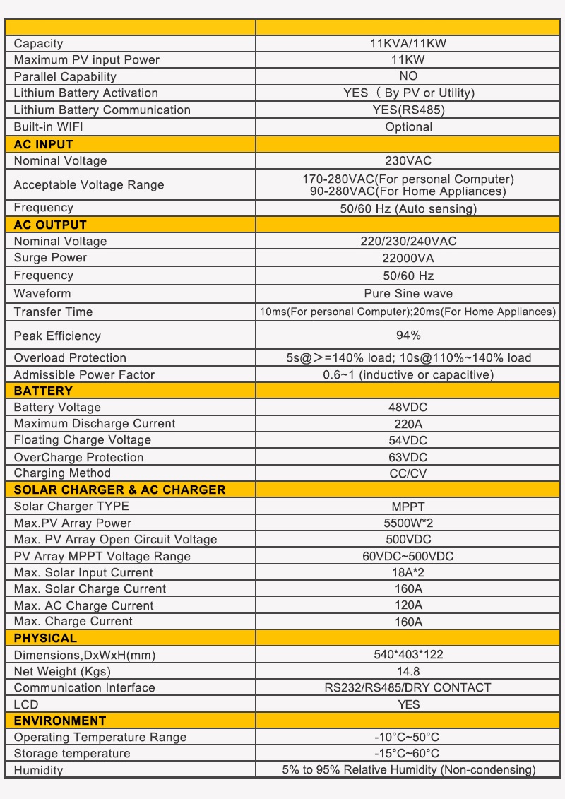- Potência máxima dos painéis solares 11000w (2 x 5500W) (60VDC a 500VDC)